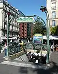 Rather than stone, Guimard used cast iron set in concrete both to reduce costs and to suit the sinuous Art Nouveau forms;[3][6] they were painted in a green emulating weathered brass.[7] (For a renovation that began in 1999, the RATP, the Paris transportation authority, restored the entrances to two slightly different shades: at sites with a lot of vegetation, vert wagon ('train-car green'), the dark green used for Parisian public works at the turn of the 20th century, and at fully urban sites, a slightly bluer shade, vert allemand ('German green').[8]) He designed standardized components, including railing cartouches incorporating the letter "M" and signs in his own distinctive lettering reading "Métropolitain" or, at narrow entrances, "Métro"; later the use of the lettering was extended to a holder for a system map and for advertising (porte-plan) with the station name above. In addition to speed (the first set of entrances were installed within six months of their design)[9] and relatively low cost in manufacture and adaptation to different sizes and locations of entrances, all of this gave the system a stylistic identity.[6][10]