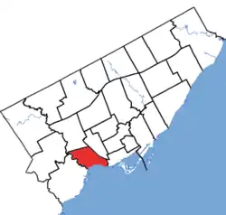 It consists of the part of the City of Toronto bounded on the south by Lake Ontario, on the west by the Humber River, and on the north and east by a line drawn from the Humber River east along the Canadian Pacific Railway, southeast along the Canadian National/Canadian Pacific Railway to Queen Street West, south along Dufferin Street to the Gardiner expressway; then westerly along said expressway to the southerly production of Spencer Street, and south along the Spencer production to the city limits in Lake Ontario. The boundary then moves westerly along the city limits to the production of the Humber River; then generally it moves northwesterly following the river back to the commencement point at the intersection of the river and the railway tracks.[2]