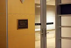 Since Ruby's death in 1967, areas in the Former Parkland Hospital where Kennedy was pronounced dead and Oswald was operated on had been remodeled. A plaque there marked the location where Trauma Room 1 was previously in the prior Parkland,[13] and then became a corridor in the hospital's radiology department. The ambulance entry remained in roughly the same location. The site of Trauma Room 1 was renovated several times since 1963. Trauma Room 1 was dismantled for renovation in 1973; all building materials and equipment from the room were retained by the government and remain in archival storage today.[14] Parkland's JFK history is noted on a wall at the new hospital[15] and at the John F. Kennedy Park for Hope, Healing and Heroes memorial on campus.[16]