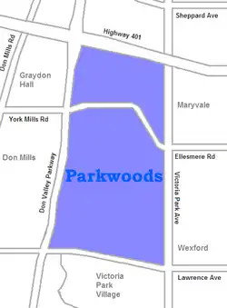 Parkwoods or sometimes referred to as Parkwoods-Donalda, is a neighbourhood in Toronto, Ontario, Canada. It is a geographically large neighbourhood located just south of Ontario Highway 401, west of Victoria Park Avenue, north of Lawrence Avenue East and east of the Don Valley Parkway.