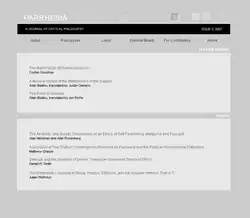 Parrhesia: A Journal of Critical Philosophy is an international open-access journal of Critical Philosophy affiliated with Melbourne School of Continental Philosophy. It is edited by four MSCP members: Alex Murray, Matthew Sharpe, Jon Roffe and Ashley Woodward.[1][2] It was launched in 2006 and has included articles by Alain Badiou[3][4] and Jacques Rancière.[5]