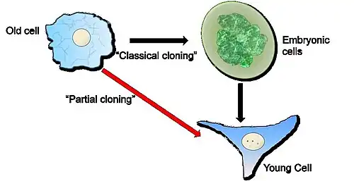 Classical cloning can rejuvenate old cells but the process demands that the old cells must artificially pass through an embryonic cell stage. Partial cloning affords the advantage that the old cells to be rejuvenated do not have to pass through the embryonic cell stage and are simply made younger.