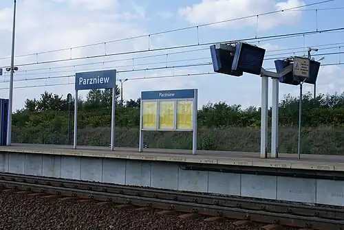 Parzniew railway station is a railway station in Parzniew, Poland. The station is served by Koleje Mazowieckie, who run trains from Skierniewice to Warszawa Wschodnia.