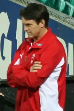 Returning to Australia and the Sydney Swans, Roos then became an assistant coach under senior coach Rodney Eade in 2001.[10] Part-way through the 2002 season, with the Swans' record becoming worse by the week, Eade resigned. The club administration started the search for a new coach and it is widely believed that negotiations with Terry Wallace were at an advanced stage. Nevertheless, when Eade finally went with several games of the minor round still to be played, Roos was appointed caretaker senior coach for the remainder of the 2002 season, a move hugely popular with Swans fans, who remembered his great contribution to the club as a player.[11][5][12]