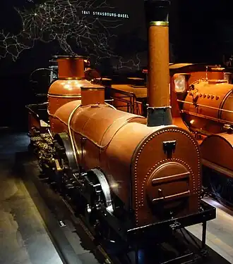The "Pays de Waes" is the second locomotive in a series of nine machines designed by the Belgian engineer Gustave De Ridder. Built in his private workshops, the locomotive was put into service on a narrow gauge line (Anvers-Saint-Nicolas-Lokeren-Gand) that was operated by the Compagnie du chemin de fer d'Anvers à Gand par Saint-Nicolas et Lokeren (a private company) in 1845,[4] a narrow gauge line ( 1,151 mm (3 ft 9+5⁄16 in) vs 1,435 mm / 4 ft 8+1⁄2 in).[5][6] The locomotive reached a speed of 60 km/h (37 mph) in 1844, the year of its construction. [7]