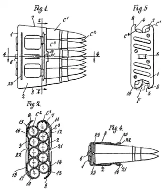 - An asymmetrical spring steel clip of ten rounds in a double-staggered column would then be inserted, feed end up, into the magazine against the spring pressure of the magazine follower; when fully inserted the clip would be caught and held by a catch. (Note: this clip, like the clip used in the Austrian Model 95 rifle, could only be inserted one way and thus could potentially cause confusion under the stress of combat). Unloading the magazine would be done by (if necessary) retracting and holding open the breech mechanism, then pushing the trigger forward from its neutral position; the clip and any remaining cartridges would be ejected upward.