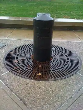The Peirce Geodetic Monument is made of brass and black granite.[1] It is cylindrical in shape, 3 feet (0.91 m) tall and 1.5 feet (0.46 m) diameter, with a top that tapers to a point topped with a metal disc. A metal grating 6 feet (1.8 m) in diameter surrounds the base in two sections.