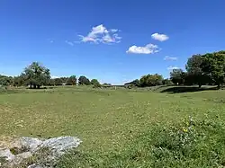 At this point, PA 23 turns south onto Schuylkill Road, passing businesses and curving to the southeast. The route becomes the border between the borough of Phoenixville to the northeast and Schuylkill Township to the southwest and crosses French Creek before passing more businesses and intersecting PA 113. At this point, PA 113 turns southeast to form a concurrency with PA 23 on Nutt Road, a three-lane road with a center left-turn lane that fully enters Phoenixville. The road passes businesses and crosses under an abandoned railroad line, at which point it continues through residential areas. PA 113 splits from PA 23 by heading northeast on Bridge Street, while PA 23 continues southeast on two-lane Nutt Road. The route runs through residential areas with some businesses and passes to the northeast of Phoenixville Hospital before crossing PA 29. The road passes more suburban development and crosses into Schuylkill Township, where it becomes Valley Forge Road and curves to the east. PA 23 crosses Pickering Creek at the dam forming Pickering Creek Reservoir to the south and turns southeast through wooded areas of residential development.[2][8] The route reaches the community of Valley Forge, where it curves east and enters Valley Forge National Historical Park, the site where General George Washington and the Continental Army made an important winter encampment during the American Revolutionary War.[2][8][9]