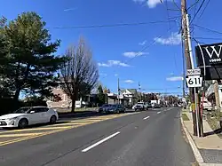 In the 1930s, US 611 was realigned to follow Delaware Drive between Martins Creek and Portland, replacing the entire length of PA 827. The former alignment of the route between Martins Creek and Mount Bethel via Bangor was designated as PA 712; this road is now unnumbered Main Street and Lower South Main Street between Martins Creek and Bangor and PA 512 between Bangor and Mount Bethel. US 611 and PA 612 switched alignments between Delaware Water Gap and Stroudsburg in the 1930s, with US 611 realigned to follow Foxtown Hill Road and Park Avenue between Delaware Water Gap and Stroudsburg and PA 612 designated to follow the former alignment of US 611 between Delaware Water Gap and Stroudsburg via East Stroudsburg along Broad Street, Brown Street, Prospect Street, Ridgeway Street, Bridge Street, and Main Street.[22] By 1940, US 611 was extended north along US 11 to follow Green Ridge Street, Main Avenue, and Market Street to end at US 6 at Keyser Avenue in Scranton.[23] In the 1930s, US 611 was widened into a multilane road across the Neshaminy Creek, between south of Doylestown and Plumsteadville, between US 46 in Portland and Slateford, between Delaware Water Gap and south of Stroudsburg, from a point north of the PA 507 intersection north to the newly-constructed PA 307 in southern Lackawanna County, and between south of Dunmore and Scranton.[22] During the 1940s, US 611 was upgraded to a multilane road between Philadelphia and south of Doylestown, between south of Stroudsburg and north of the PA 507 intersection, and along a short stretch to the north of PA 348 in Lackawanna County.[24] By 1950, US 611 was realigned to bypass Pipersville to the west, with the former alignment becoming Old Easton Road.