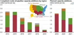 Completed and forecast petroleum pipeline capacity additions by region, 2014–2021, as of May 2019