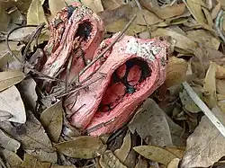 Phallaceae is a family of fungi, commonly known as stinkhorns, within the order Phallales. Stinkhorns have a worldwide distribution, but are especially prevalent in tropical regions. They are known for their foul-smelling, sticky spore masses, or gleba, borne on the end of a stalk called the receptaculum. The characteristic fruiting-body structure, a single, unbranched receptaculum with an externally attached gleba on the upper part, distinguishes the Phallaceae from other families in the Phallales. The spore mass typically smells of carrion or dung, and attracts flies, beetles and other insects to help disperse the spores. Although there is great diversity in body structure shape among the various genera, all species in the Phallaceae begin their development as oval or round structures known as "eggs". The appearance of Phallaceae is often sudden, as gleba can erupt from the underground egg and burst open within an hour.[3] According to a 2008 estimate, the family contains 21 genera and 77 species.[4]