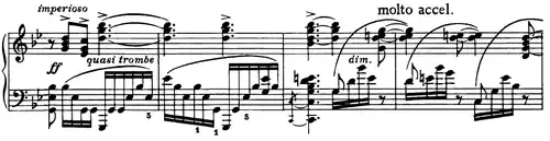 | 6 | 313–329 | At m. 313 the allegro fantastico passage burst in a climax based on the meno mosso theme. The four-bar phrase is stated three times, each one a fifth lower, first in D♭ major, then in G♭ and finally in B. However, the expected final climax is interrupted by the reexposition of the first theme in pp. | ||