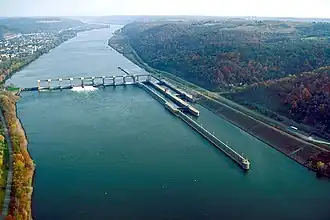 Pike Island Lock and Dam is the fifth lock and dam on the Ohio River, located in Yorkville, Ohio 84 miles downstream of Pittsburgh. There are two locks, one for commercial barge traffic that's 1,200 feet long by 110 feet wide, and the auxiliary lock is 600 feet long by 110 feet wide.[1]