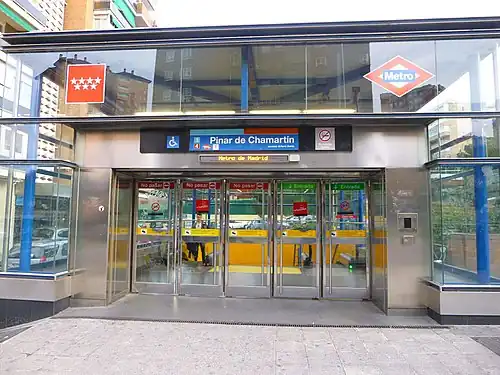 Pinar de Chamartín [piˈnaɾ ðe tʃamaɾˈtin] is a station on the Madrid Metro, opened to the public on 4 November, 2007. [1] It is located in fare Zone A and serves the area of Pinar de Chamartín.[2][3]