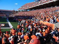 On 2 November 2015, students at the University of Kansas illegally broke into Memorial Stadium and tore down the goalpost at the south end of the field following the Kansas City Royals' World Series clinching victory vs. the New York Mets at Citi Field.[32] The goalposts at the stadium were also torn down after victories by the Jayhawks, vs. Nebraska in 2005 and 2007, West Virginia in 2013, Iowa State in 2014, Texas in 2016, Oklahoma State in 2022, Oklahoma in 2023, and in 1994 by fans of archrival Kansas State.