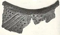 This pottery is characterized by shell tempered, globular vessels with cordmarked surfaces and straight to excurved rim profile. Decoration, when present, consists of trailed or incised decoration forming arches and festoons, often combined with punctates. Notched lips and rim lugs are also common.[11][12][23]