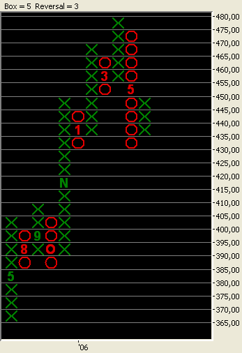 The charts are constructed by deciding on the value represented by each X and O. Any price change below this value is ignored so point and figure acts as a sieve to filter out the smaller price changes. The charts change column when the price changes direction by the value of a certain number of Xs or Os. Traditionally this was one and is called a 1 box reversal chart. More common is three, called a 3 box reversal chart.