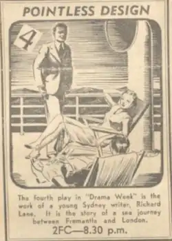 Pointless Design is a 1938 Australian radio play by Richard Lane. It was Lane's first notable radio work although his second one produced (after The Man was Blind). It was inspired by Lane's travels to Europe.[1][2]