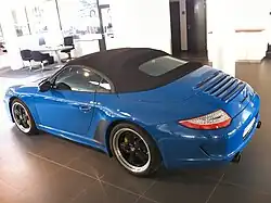 The Porsche 997 is the sixth generation of the Porsche 911 sports car manufactured and sold by the German automobile manufacturer Porsche. It was sold between 2004 (for the 2005 model year) and 2013. Production of the Carrera and Carrera S coupé began in early 2004, and the all-wheel drive Carrera 4 and Carrera 4S began to be delivered to customers in November 2005. Deliveries of the Turbo and GT3 derivatives were carried out in late 2006, along with the GT2 in 2007. In addition to the coupé and cabriolet versions, Targa versions of the Carrera 4 and Carrera 4S were also available, which continued the trend of the "glass canopy" roof design utilized during the 993 and 996 generations. This was later reverted to the classic targa top layout used in earlier models of the 911 Targa with the introduction of the 991 generation.