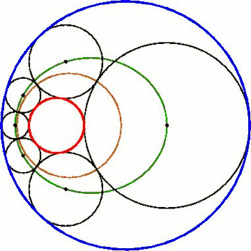 | January 2011 |  | A Steiner chain is a set of n circles, all of which are tangent to two given non-intersecting circles, where n is finite and each circle in the chain is tangent to the previous and next circles in the chain. In the usual closed Steiner chains, the first and last circles are also tangent to each other; by contrast, in open Steiner chains, they need not be. The given circles do not intersect, but otherwise are unconstrained; the smaller circle may lie completely inside or outside of the larger circle. In these cases, the centers of Steiner-chain circles lie on an ellipse or a hyperbola, respectively. | WillowW | Steiner chain |