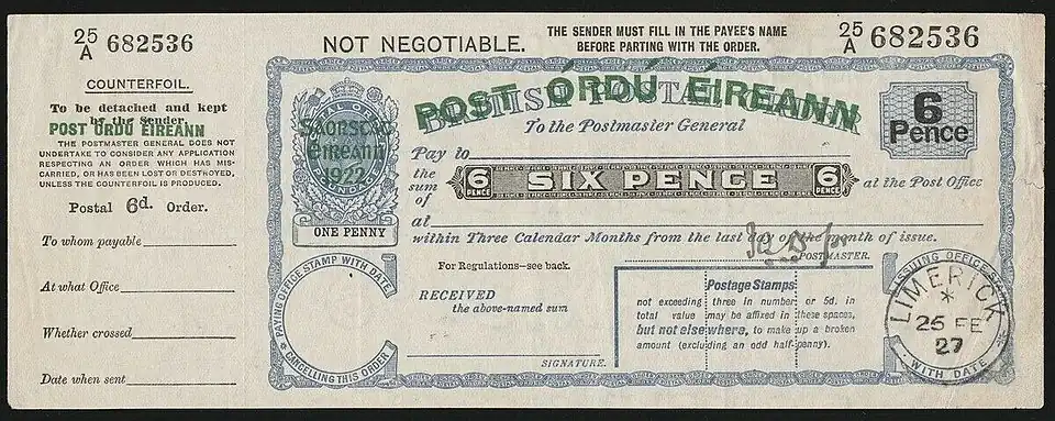 - ^ "S.I. No. 485/2001 - The Postal Money Order (No. 1) Regulations, 2001". Statuary Instruments. Government of Ireland. 1 November 2001. Retrieved 26 February 2018.