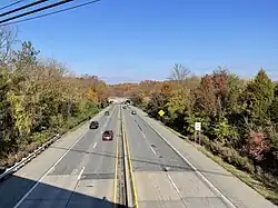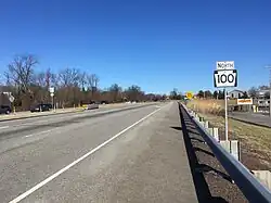 In the 1960s, the Pennsylvania Department of Highways planned for an expressway just east of the PA 100 corridor that would run from the Pennsylvania Turnpike interchange in Uwchlan Township to US 202 near West Chester, though these plans were never fully realized.[28] However, in 1968, a 2-mile (3.2 km) long, four-lane freeway was built connecting PA 100 south of Exton to US 202 north of West Chester. The freeway was officially unsigned, but was colloquially referred to as the "PA 100 Spur" and was designated as State Route 2023 (SR 2023) when the Location Referencing System was established in 1987.[29][30][24][31] In the 1970s, PA 100 was widened into a divided highway between Exton and Lionville.[32]