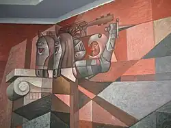The mural is divided into three parts: a flat, central panel measuring 20 by 6 meters, and two sides panels set off at oblique angles to the central part. Each panel measures 7.6 by 6 meters. The mural as a whole is 211.2 m2.[4] In addition to this, the mural makes use of a staircase with right angles leading up to a second-story art gallery, increasing the total area to 300 m2.