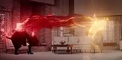 Tara DeMarco served as the visual effects supervisor for WandaVision, with the episode's visual effects created by SSVFX, Framestore, Mr. X, Industrial Light & Magic, The Yard VFX, Digital Domain, Cantina Creative, RISE, Rodeo FX, and capital T.[33][25]: 42:42–42:57 Rodeo FX developed the visual effects for the Hex boundary,[34] based on the magnetization of old CRT television screens when brought into contact with magnets.[35] The boundary is depicted as red to reflect Maximoff's anger and to reinforce that it is a hard barrier,[36] with reflections of the environment that can be seen during daytime for which Rodeo was inspired by reflective television screens.[37] The look of Agatha's magic was developed by Framestore during work on the scene in this episode where she controls a cicada in her lair.[38][39] The look of this effect was then used by other vendors who created Agatha's magic in other episodes of the series.[38] DeMarco explained that they originally planned for Agatha's magic to just be a purple version of Maximoff's magic, but the texture was adjusted until they were comfortable with its appearance in the scene. The final look has more of a black, ink-like texture than Maximoff's magic to make it appear more evil,[39] with Framestore trying to give it a "retroness and period authenticity" while aligning with the appearance of magic in the MCU films.[38] The effect of the Scarlet Witch appearing in the Mind Stone and being reflected in Maximoff's eyes used footage of Olsen in costume and on wires that was filmed for the battle in the final episode.[40]