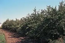 The roots are shallow, widely spread, and send up suckers.[12] The numerous stems per plant become scaly with age. The tree has a crown width and height of 10 feet at maturity.[16] The branches are thorny. The leaves are alternately arranged, with an oval shape. The leaf length is usually 5.1–10.2 centimetres (2–4 inches) long. The upper surface of the leaf is dark green; the underside is smooth and pale. The small white flowers with five petals occur singly or in clusters in the leaf axils. The globular fruits are about 2.5 cm (1 in) in diameter.[14]