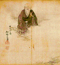 ![]() A depiction of the folkloric Puhua (Fuke in Japanese) in the clouds, ringing his hand-bell with a clapper (called to in Chinese, taku in Japanese). | |