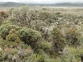 The highest daytime temperatures are between 14 and 16 °C (57 and 61 °F), and the coldest nighttime temperatures below freezing.[4] The average yearly rainfall is 2,500 millimetres (98 in) and tend to decrease as elevation increases. Frost occurs frequently above 3,000 m (9,800 ft) and almost daily above 4,200 m (13,800 ft).[6]