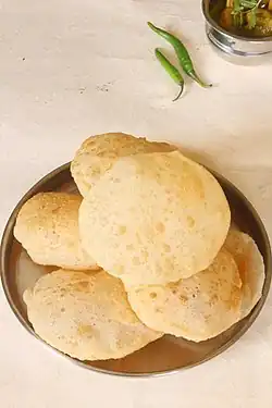 Puri, also poori, is a type of deep-fried bread, made from unleavened whole-wheat flour, originated from the Indian subcontinent.