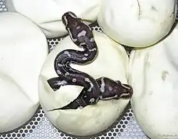 Python anchietae exhibits hisses, which are mostly bluff.[3] Its diet consists of small mammals and birds.[3] It is oviparous, with small clutches of four to five eggs being produced at a time. Hatchlings are 43–46 cm (17–18 in)long.[3]