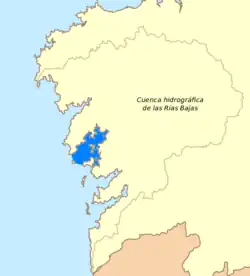 The Ría de Arousa is a ria, a saline estuary in Galicia, Spain. It is one of the five Rías Baixas, and located between the Ría de Muros e Noia (es, gl) to the north and the Ria de Pontevedra to the south. The peninsulas of Barbanza, in the province of A Coruña, and O Salnés, in the province of Pontevedra, define the ria's coasts to the north and south respectively.