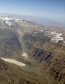 Confluence of the Río Blanco and the Los Leones river. Cerro El Plomo is visible in the upper left portion of the image, while Los Leones Dam can be seen in the lower portion of the image. | |