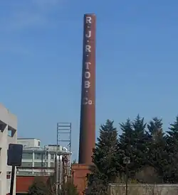 The son of a tobacco farmer in Virginia, Richard Joshua "R. J." Reynolds sold his shares of his father's company in Patrick County, Virginia, and ventured to the nearest town with a railroad connection, Winston-Salem, to start his own tobacco company.[3] He bought his first factory building from the Moravian Church and established the "little red factory" with seasonal workers. The first year, he produced 150,000 pounds (68,000 kg) of tobacco; by the 1890s, production had increased to several million pounds per year.[3] The company's factory buildings were the largest buildings in Winston-Salem, with new technologies such as steam power and electric lights.[3] The second primary factory building was the oldest Reynolds factory still standing and was sold to Forsyth County in 1990.[3]
