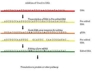 46. ^ Kable ML, Heidmann S, Stuart KD (May 1997). "RNA editing: getting U into RNA". Trends in Biochemical Sciences. 22 (5): 162–166. doi:10.1016/S0968-0004(97)01041-4. PMID 9175474.