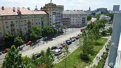 In addition to the streets mentioned below, the intersection is crossed by tram lines north-south, trolleybus lines east-west, and bus routes in all directions.