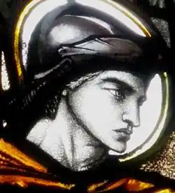 One of Montmorency's earliest commissions was for a two-light war memorial window in the South Chapel of St Botolph's Church in Cambridge, Cambridgeshire. The window depicts St George and St Michael. A close-up of part of the window is shown at the beginning of this article and further images are shown below. Montmorency's window is located in a side chapel which is locked for most of the time but the window is still visible through a glass screen. The church has an elaborate Chancel by the Victorian architect George Frederick Bodley. There is a memorial to Darwin, whose family were parishioners of St Botolph's, by the vestry door.[3]