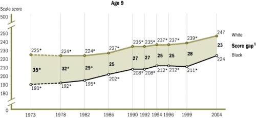 The NAEP has since collected and analyzed data through 2008. Overall, the White-Hispanic and the White-Black gap for NAEP scores have significantly decreased since the 1970s.[33] The Black-White Gap demonstrates:[33]