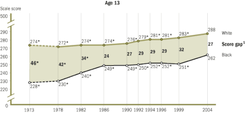 The National Assessment of Educational Progress (NAEP) has been testing seventeen-year-olds since 1971. From 1971 to 1996, the black-white reading gap shrank by almost one half and the math gap by almost one third.[32] Specifically, blacks scored an average of 239 points, and whites scored an average of 291 points on the NAEP reading tests in 1971. In 1990, blacks scored an average of 267, and whites scored an average of 297 points. On NAEP math tests in 1973, blacks scored an average of 270, and whites scored 310. In 1990, black average score was 289 and whites scored an average of 310 points. For Hispanics, the average NAEP math score for seventeen-year-olds in 1973 was 277 and 310 for whites. In 1990, the average score among Hispanics was 284 compared with 310 for whites.[21]