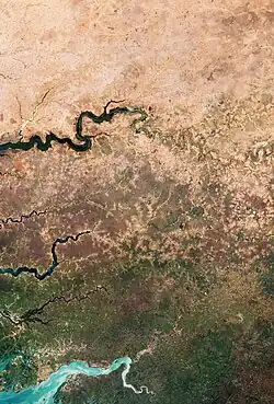 The Sahel is an ecologically (rather than geopolitically) defined region of Africa. The noun Sahel comes from the Arabic sāḥil (Arabic: ساحل) describing a border, shore or edge, which aptly describes the transitional areas of Africa where savanna becomes the hyper-arid Sahara Desert. (According to the Concise Oxford Dictionary of World Place Names, "The Arabs considered the Sahara to be a huge ocean with the Sahel as its shore."[5]) The Sahel crosses Senegal, The Gambia, Mauritania, Mali, Burkina Faso, Ghana, Niger, Nigeria, Cameroon, Chad, Central African Republic, South Sudan, Sudan, and Eritrea in a belt up to 1,000 km (620 mi) wide that spans 5,400 km (3,360 mi) from the Atlantic Ocean in the west to the Red Sea in the east. The Sahel is marked by decreasing levels of precipitation from south to north, but what defines a dryland ecosystem is not necessarily low rainfall. In some cases the dryness is due to persistent high levels of evaporation (due to heat or desiccating winds). Unpredictable rainfall is often also a factor.[6]