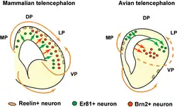 Reelin-DAB1 interactions could have played a key role in the structural evolution of the cortex that evolved from a single layer in the common predecessor of the amniotes into multiple-layered cortex of contemporary mammals.[69] Research shows that reelin expression goes up as the cortex becomes more complex, reaching the maximum in the human brain in which the reelin-secreting Cajal-Retzius cells have significantly more complex axonal arbour.[70] Reelin is present in the telencephalon of all the vertebrates studied so far, but the pattern of expression differs widely. For example, zebrafish have no Cajal-Retzius cells at all; instead, the protein is being secreted by other neurons.[71][72] These cells do not form a dedicated layer in amphibians, and radial migration in their brains is very weak.[71]
