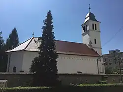 The church is believed to have been built on the site of an earlier medieval church. According to the inscription on the plaque next to the pulpit, its foundation stone was laid on May 30, 1679, and its construction was completed in 1680. It was funded through the last will of Count Francis Rhédey,[1] and is the city’s oldest building. The interior was redesigned and the ceiling repaired in 1786. In 1944, fighting during World War II caused serious damage, which was repaired in 1946.[2]