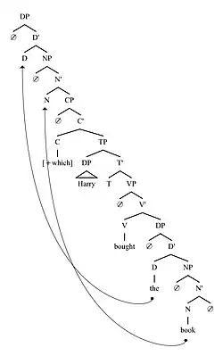 The promotional analysis is a transformational analysis from 1973 depicting relative clauses in English, and how relative pronouns are introduced into the embedded clause. This analysis assumes that there is no overt head noun in the deep structure of the main clause. In order to form a relative construction, the noun phrase from the embedded clause is promoted to the empty head of the noun phrase of the main clause. From there, a corresponding relative pronoun leaves a trace in the space of the vacated noun phrase in the embedded clause.[8] For example: