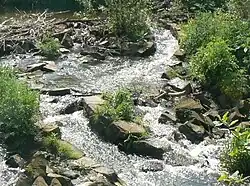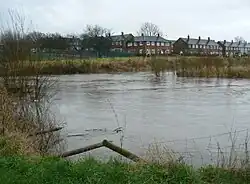 There is a pumping station on the left bank operated by British Nuclear Fuels,[17] followed by a copse of semi-ancient woodland and a Biological Heritage Site reedbed at Savick Bridge, which carries the main A583 road. The wooden sculpture 'Rook' by Thompson Dagnall is located on the north bank, and can also be seen from the A583 road.[65] Deepdale Brook joins on the right bank, and the river is crossed by the A583 road. The sea lock is a short distance below the bridge, and the brook continues to the west of Lea Marsh, until it reaches the River Ribble. Preston Docks marina is upstream from the junction, on the north bank of the Ribble, and the River Douglas, which provides the route to the Rufford branch of the Leeds and Liverpool Canal is downstream, on the south bank.[58]