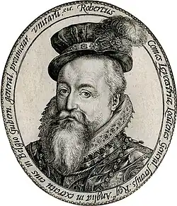 Robert Dudley, 1st Earl of Leicester (24 June 1532[note 1] – 4 September 1588) was an English statesman and the favourite of Elizabeth I from her accession until his death. He was a suitor for the queen's hand for many years.[1][2] He is commonly simply called Leicester in the historiography of the Eighty Years' War, which generally assesses his brief stint as governor-general (landvoogd) of the United Provinces of the Netherlands from December 1585 to April 1587 to have been a failure.
