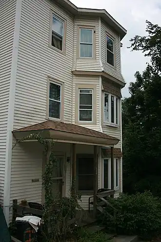 The Rodney Davis Three-Decker is located in a residential area on Worcester's east side Belmont Hill neighborhood, on the south side of Catharine Street between Eastern and Rodney Streets. It is a three-story wood-frame structure, with a hip roof and its exterior finished in modern siding. It has an asymmetrical front facade, with a projecting three-story polygonal bay on the right, and a single bay on the left with the building entrance on the ground floor and windows on the upper floors. The entrance is sheltered by a low-pitch gable roof supported by modern square posts. The porch once had more elaborate Queen Anne decorations, including turned posts and balusters, but these have been lost. The bays have flared skirting below the windows, which was once finished in decorative cut shingles.[2]