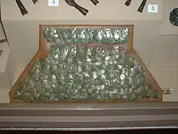 Legionary soldiers of the 1st and 2nd centuries used a variety of armour types. Some wore mail shirts, while others wore scale armour or lorica segmentata or laminated-strip cuirass. This last type was a complex piece of armour which in certain circumstances provided superior protection to the other types of Roman armour, mail armour (lorica hamata) and scale armour (lorica squamata). The testing of modern replicas has demonstrated that this kind of armour was impenetrable to most direct hits and missile strikes. It was, however, uncomfortable without padding: re-enactors have confirmed that wearing a padded undergarment known as a subarmalis relieves the wearer from bruising both from prolonged wear and from shock produced by weapon blows against the armour. It was also expensive to produce and difficult to maintain.[23] In the 3rd century, the segmentata appears to have been dropped and troops are depicted wearing mail armour (mainly) or scale, the standard armour of the 2nd-century auxilia. The artistic record shows that most late soldiers wore metal armour, despite Vegetius's statement to the contrary. For example, illustrations in the Notitia show that the army's fabricae (arms factories) were producing mail armour at the end of the 4th century.[24] Actual examples of both scale armour and quite large sections of mail have been recovered, at Trier and Weiler-La-Tour respectively, within 4th-century contexts.[25] Officers generally seem to have worn bronze or iron cuirasses, as in the days of the principate, together with traditional pteruges.[26]