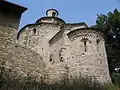 The upper matronaeum has also eight columns which creates a circular ambulatory facing the central hollow of the lower section. It has also a small apse with traces of frescoes. The capitals on both floors, and the portal, have well sculpted zoomorphic, human and geometric figures.